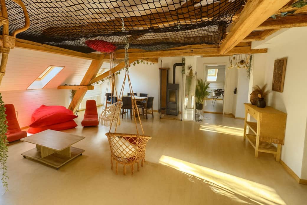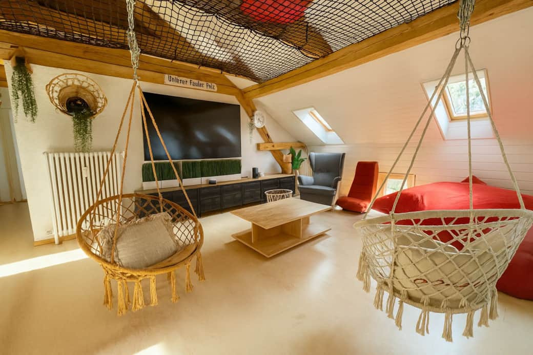 Ob Geburtstag, Vereinsreise oder gemeinsames Wochenende mit Freunden – unsere Loft-Wohnung bietet genug Platz und Ausstattung für unvergessliche gemeinsame Erlebnisse. Das außergewöhnliche Ambiente mit Netzen und Schaukeln zaubert allen Gästen ein Lächeln ins Gesicht. Ein respektvoller Umgang mit unserer Einrichtung ist uns wichtig – Feiern gern, aber bitte rücksichtsvoll und nachbarschaftsfreundlich